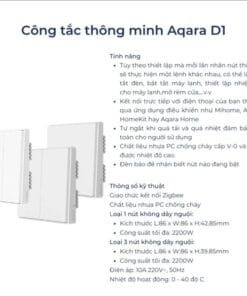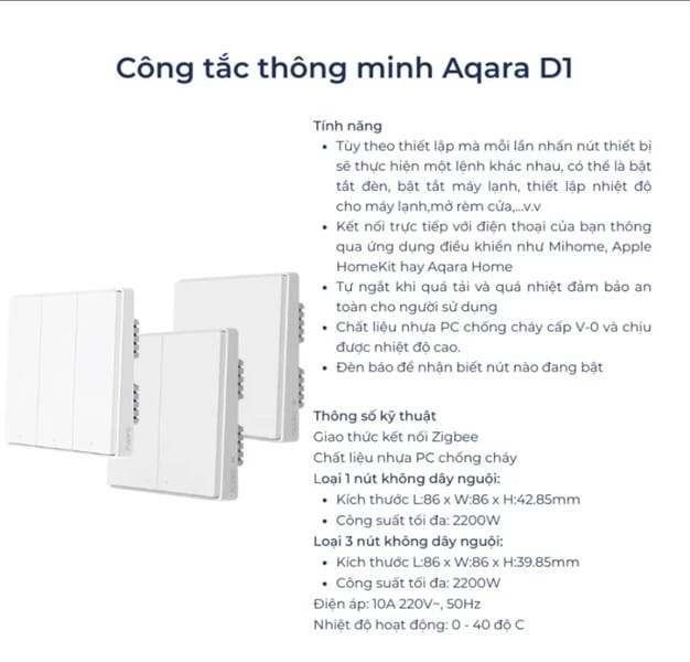 1. Thiết kế tinh tếCông tắc thông minh Aqara D1 có từ 1 đến 3 nút được dùng để điều khiển bật/tắt đèn riêng biệt một cách nhanh chóng và đơn giản nhất.